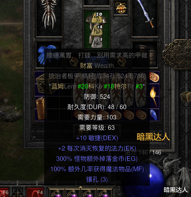 衣服:符文之语“财富”,力量需求较低的三孔灰色品质衣服作为底材,符文顺序为20号(蓝姆Lem)+18号(科Ko)+3号(特尔Tir)