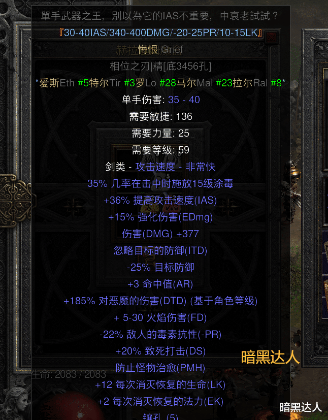 武器:符文之语“悔恨”,考虑到成本建议与圣骑士共用一把,底材选择5孔灰色品质“相位之刃”(省去修理烦恼),符文顺序5号(艾斯Eth)+3号(特尔Tir)+28号(罗Lo)+23号(马尔Mal)+8号(拉尔Ral)