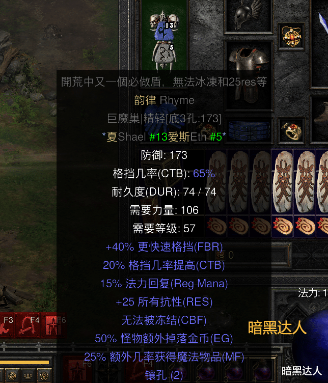盾牌:符文之语“韵律”,底材选择2孔灰色盾牌,符文顺序13号(夏Shael)+5号(艾斯Eth),或暗金盾牌“暴风之盾”(任务打孔镶个32号符文,无法被冰冻)。