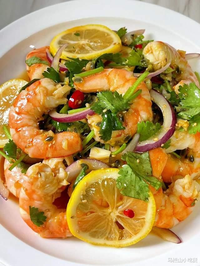 柠檬酸辣虾,开胃必备!虾煮熟过冰水,加柠檬+小米辣+香菜+生抽+醋,冷藏更入味,清爽解腻。