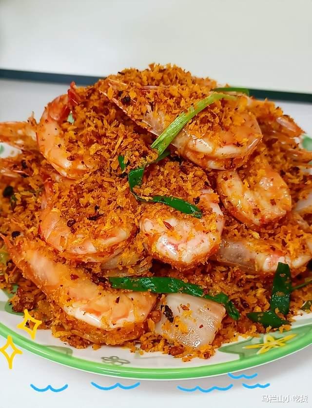 避风塘炒虾,港式风味!蒜酥+面包糠炒香和炸虾拌匀,焦香酥脆。