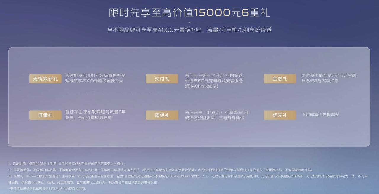 购车环节,银河 L6 EM-i 大幅降低准入门槛。7.78 万元起的限时权益价,在同级别混动车型中极具竞争力,让普通家庭无需大幅增加预算就能拥有高品质混动车型。更贴心的是,11 月购车可享受0息金融方案,灵活的首付比例与合理的月供规划,有效减轻家庭的短期资金压力,避免因买车影响日常生活质量。同时,叠加的至高 15000 元六重好礼诚意满满,包含置换补贴、免费充电桩安装等福利,其中充电桩安装服务直接解决了日常充电的后顾之忧,让纯电通勤成为可能,进一步降低后续用车成本。
