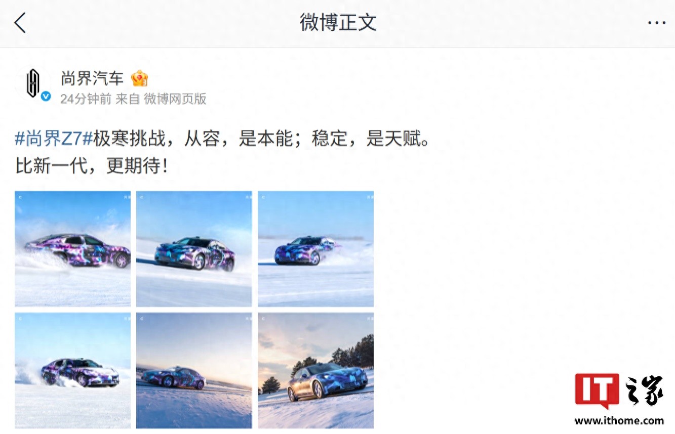 2 月 5 日消息,鸿蒙智行尚界汽车官方今日发布了尚界 Z7 轿跑官图(贴有伪装车衣),从图片和微博配文来看,尚界 Z7 已开启冰雪极端环境测试。后续还有望发布实车冬测视频。