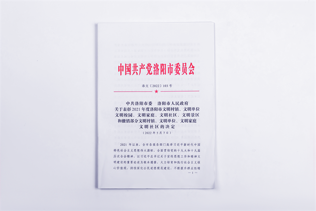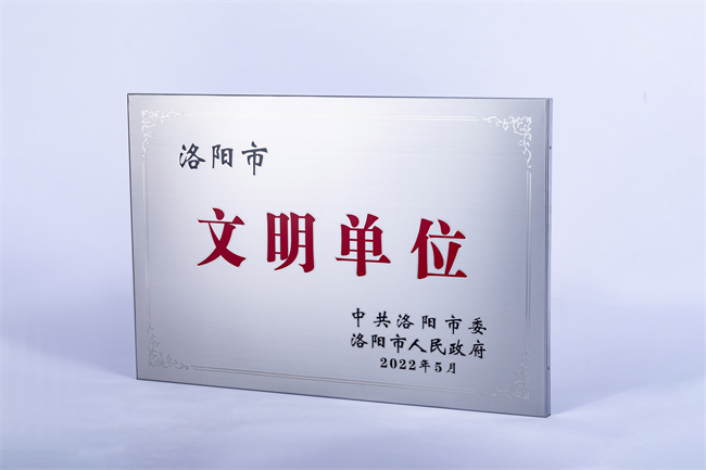 “洛阳市文明单位”称号由市委、市政府授予,皆在表彰积极培育和践行社会主义核心价值观,经济建设、政治建设、文化建设、社会建设、文明建设和党的建设全面发展,精神文明建设成效突出、职工素质较高、社会形象良好,充分发挥示范作用的单位。