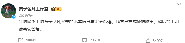 就在爆料发酵不到2小时,黄子弘凡工作室火速下场辟谣,发布正式声明,态度明确又强硬,核心内容咱一字不差搬过来,实锤可查: “针对网络上对黄子弘凡父亲的不实信息与恶意造谣,我方已完成证据收集,稍后给出明确事实答复。” 没有多余的官方套话,不回避、不敷衍,直接定性爆料为“恶意造谣”,还明确表示已经固定证据,后续会进一步澄清,这波反应速度,真的太给力了!