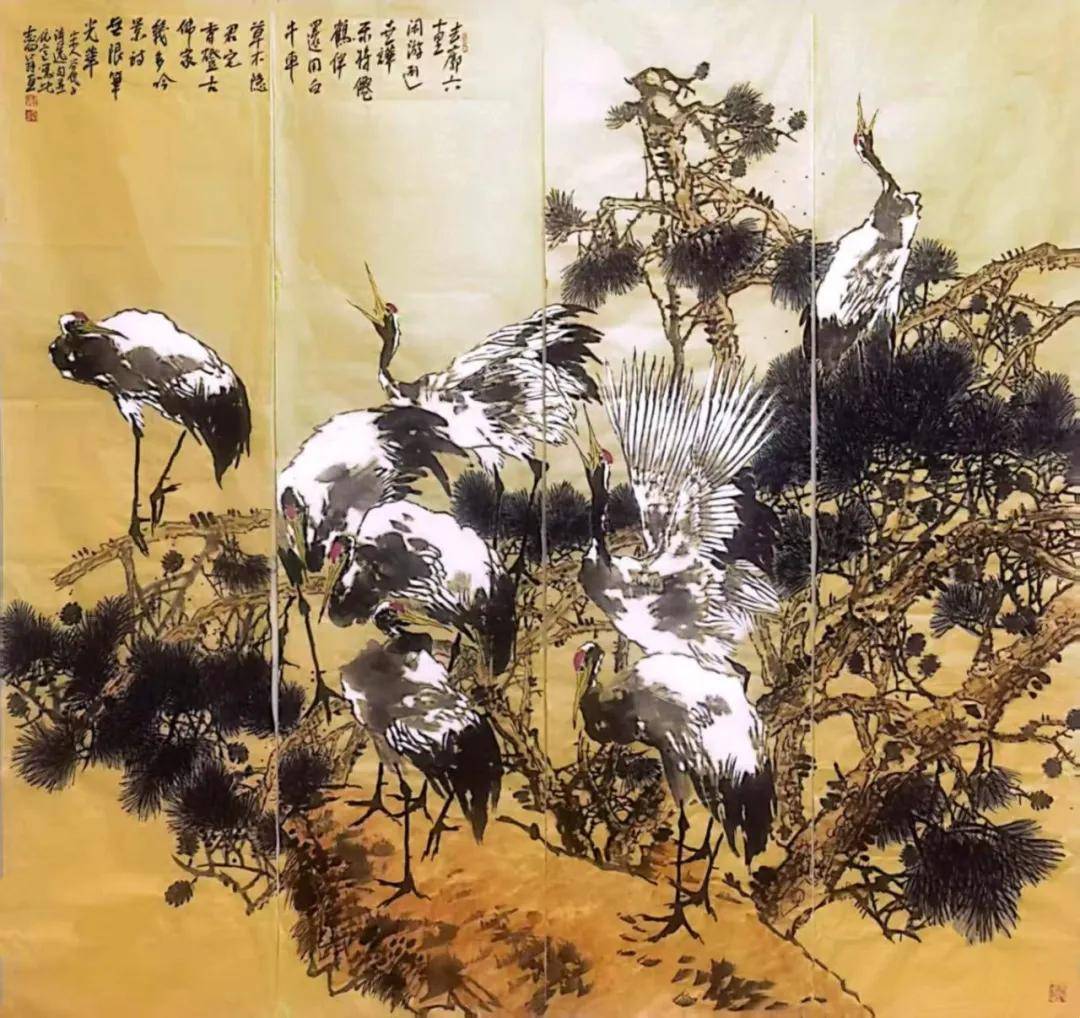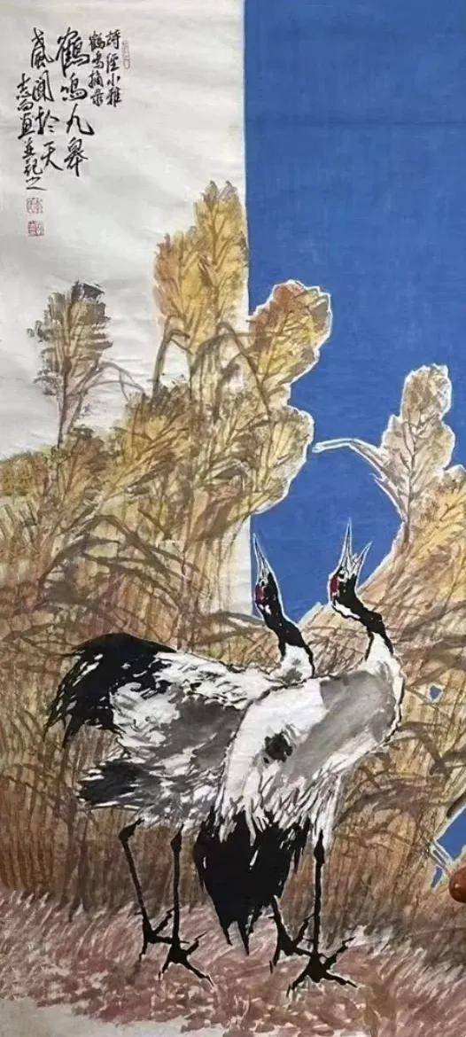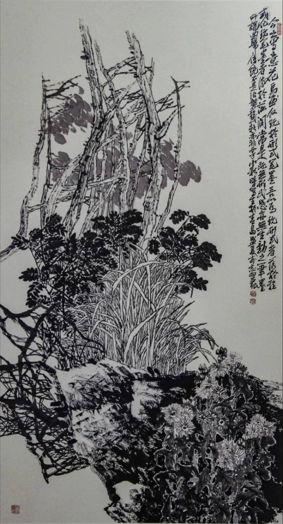 (C)有人将绘画分为密体和疏体两大类,关于“密体好还是疏体好”的争论长期存在。李志向先生认为,只要艺术品味达标,密体与疏体并无优劣之分。李可染夫人称李可染的画为密体,而大部分人认为徐渭、八大的画为疏体,若问徐渭、八大与李可染的画孰优孰劣,其实就像饮食偏好——有人喜欢辛辣,有人偏爱甜酸,难以用统一标准评判。主题性花鸟画兼收密体与疏体的特点,大家常见的多为密体作品,但李志向先生的《锦绣河山放声歌》是典型的疏体,且达到了相当高的艺术水平:画中三只鹅笔墨极简,形式感却格外强烈。(下期见此图)