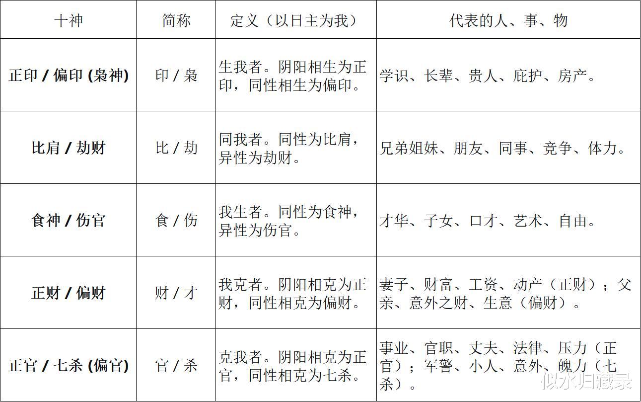 2. 排十神(定义一切社会人伦关系)十神是八字将五行生克关系“人格化”的核心,其规则完全由 日主(我) 与其他干支的五行生克关系决定: