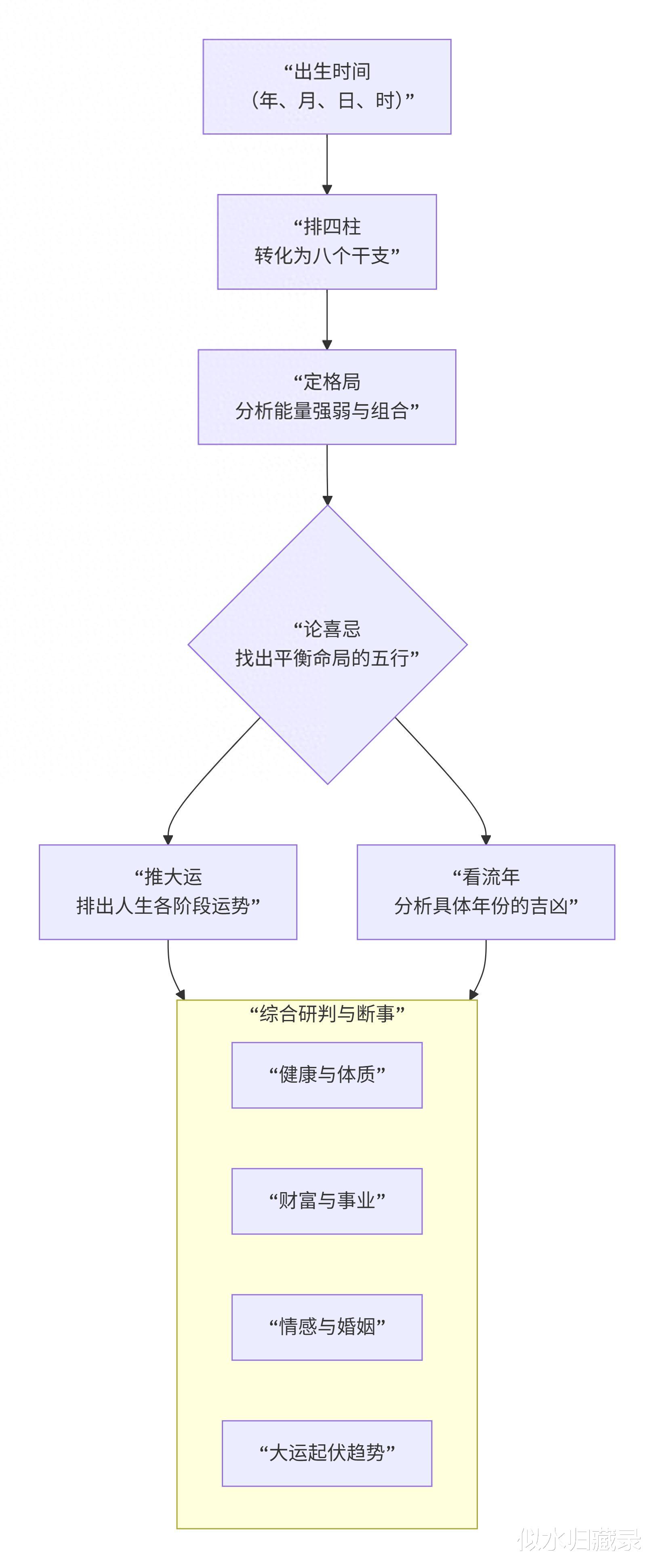 下图为你揭示了从出生信息到命运解读的完整逻辑链与核心分析框架:
