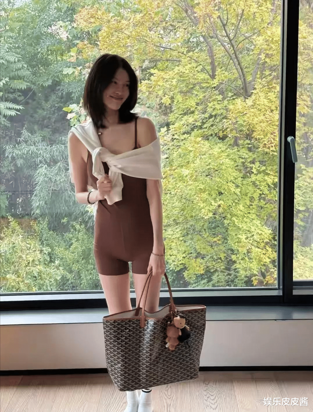 看得出,何穗这身打扮也是专门搭配的,穿着褐色的连体紧身装,肩膀上披着一个白色的外套,手里提着一个大包,穿着白色的袜子,可见是经过很用心的搭配,不得不说超模的眼光确实不错,搭配起来,直接让整个人精神很多,身材也得到了展示。