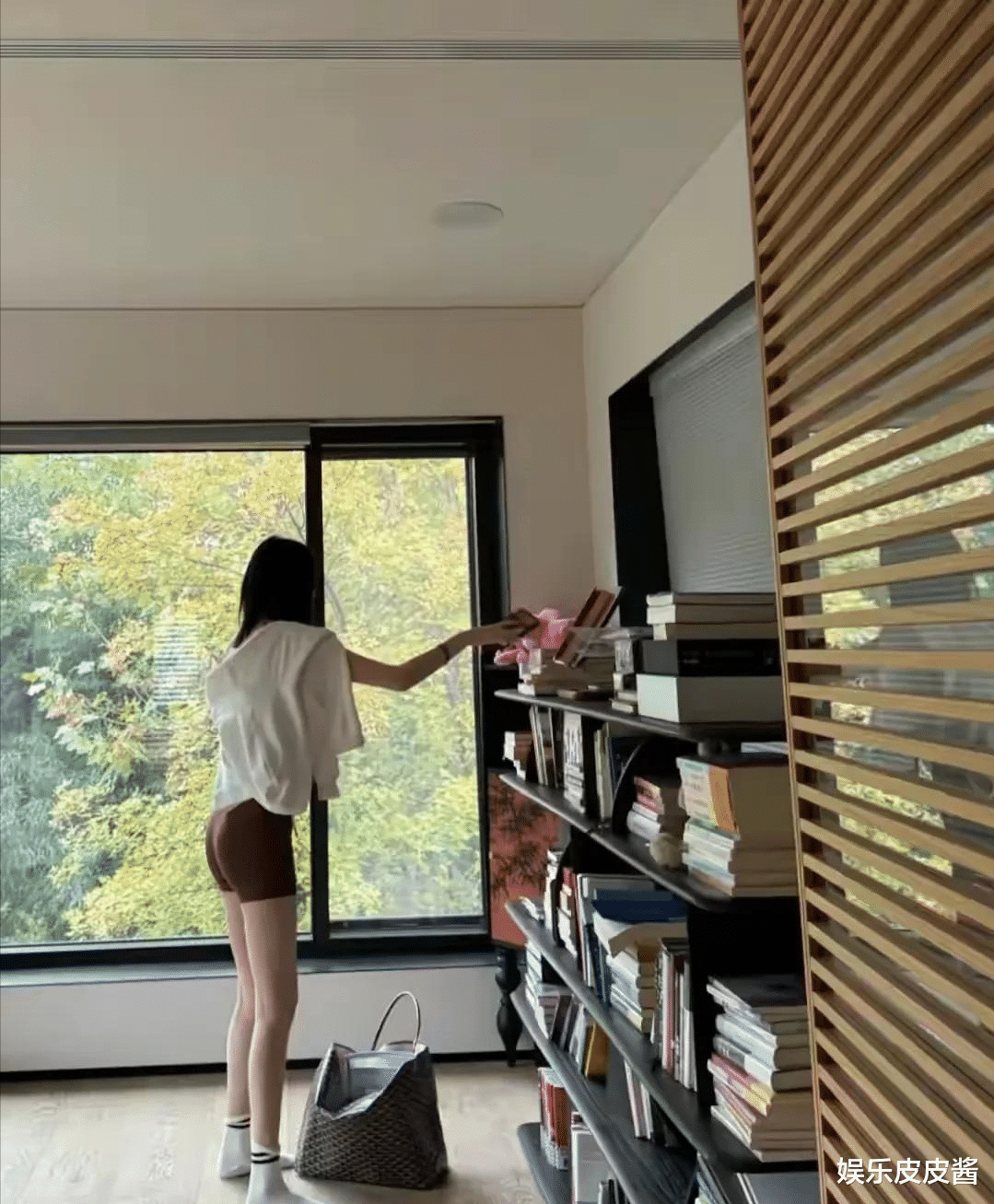 然后就是何穗站起来找书的照片,我的天这身高比书架还高,这178CM的身材比例简直绝了,谁能想到这是刚生完孩子一个月的身材,保养和恢复的是真好。