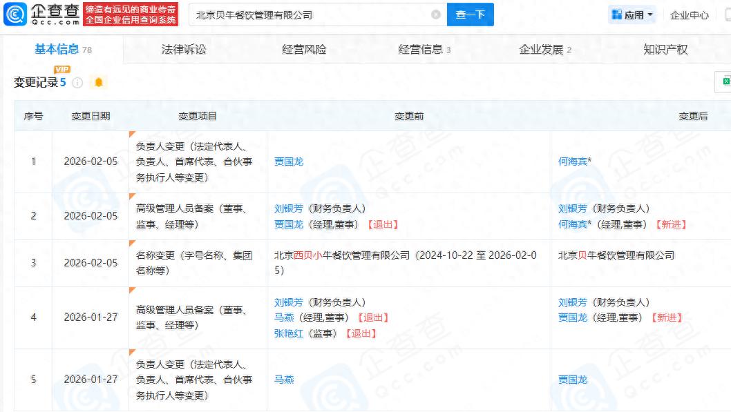 企查查APP显示,近日,北京西贝小牛餐饮管理有限公司发生工商变更,公司更名为北京贝牛餐饮管理有限公司,贾国龙卸任法定代表人、经理、董事职位,由何海宾接任。值得注意的是,1月27日,贾国龙刚刚接任该公司上述高管职务。目前,该公司由内蒙古西贝餐饮集团有限公司、内蒙古贾国龙功夫菜食品销售有限公司共同持股。