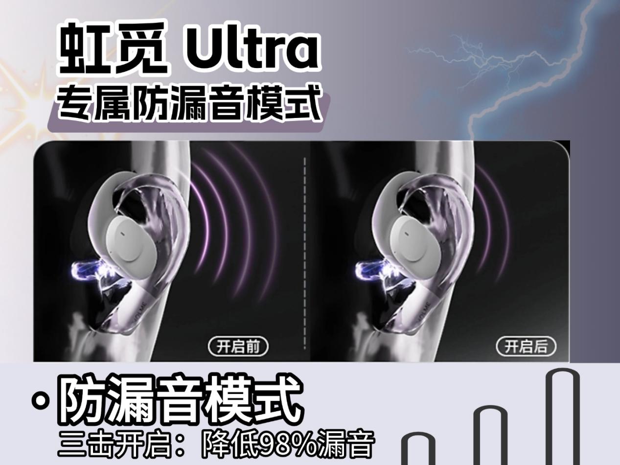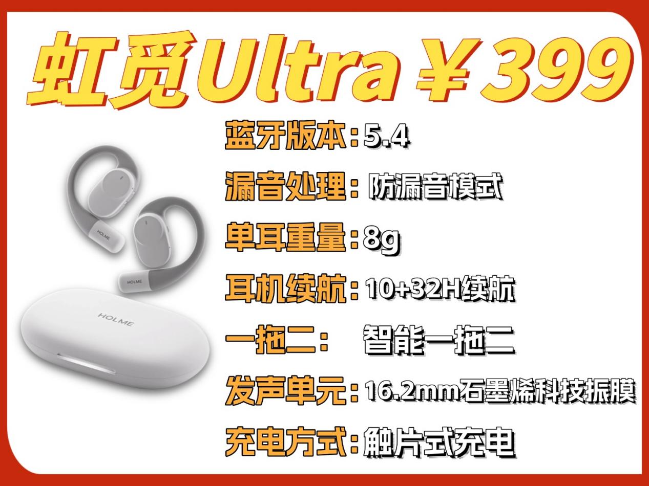 虹觅Ultra开放式耳机堪称全能王!16.2mm石墨烯振膜搭配H-zone全景空间音效,高音透亮、低音带感,人声传达清晰,还原音乐细节。单耳仅8克重,液态硅胶材质贴合耳部轮廓,戴一整天都不累。续航长达32小时,触片式充电随放随充。三击开启防漏音模式,不怕隐私外泄。IPX6防水,运动暴汗也不怕;四麦降噪,闹市打电话也清晰。5.4蓝牙芯片让其能在任何场合都能稳定连接,让耳机的整体表现提升了一个等级,智能一拖二还能同时连两台设备切换自如,各方面都很能打,性价比直接拉满!