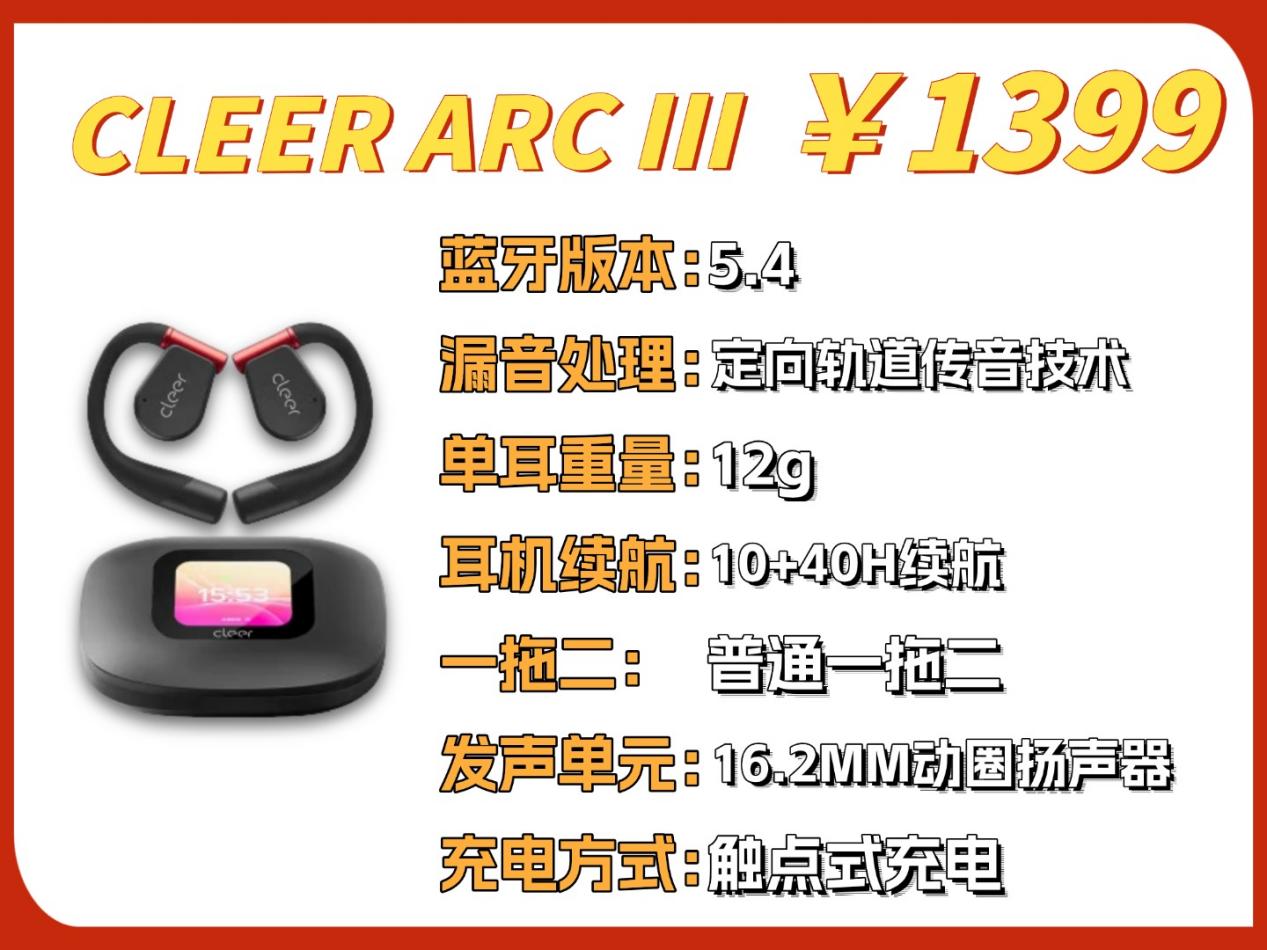 CLEER ARC III 单个耳机重量为12g,采用弹性仿生耳挂设计与0度硅胶材质,可大幅减轻佩戴时的不适感,带来自然且不闷堵的体验。耳机配备了高精度6轴传感器和16.2MM动圈扬声器,能出色地区分声音强弱的过渡,精准还原乐器音色,保留音乐细节。CLEER ARC III 的防水等级达到IPX7,单耳续航时间为10小时,若搭配耳机仓则可实现40小时的续航。双麦通话降噪功能确保即使在嘈杂环境中,你的声音依然能够清晰传达。