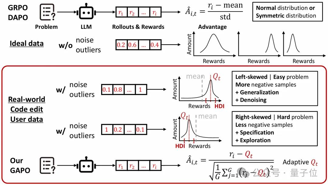 GAPO的创新突破:精准降噪+稳健估计,突破真实数据训练困局针对“复杂上下文→rollout噪声→优势值估计不准”的核心痛点,GAPO在不改变现有分组相对RL框架核心目标的前提下,仅通过优化优势计算环节,实现“即插即用”的高效突破,其原理可通过论文关键图表直观呈现: