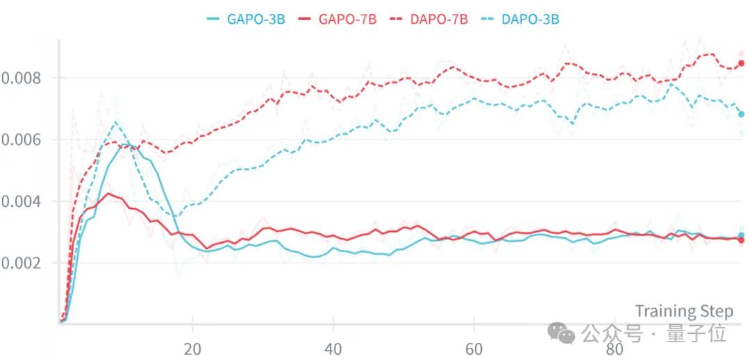 同时,GPU吞吐量曲线显示,GAPO让3B模型的平均吞吐量提升4.96%,训练后期优势更明显——对企业而言,这意味着用同样的算力,能从真实复杂数据中获得更好的训练效果,从而降低AI模型训练成本。
