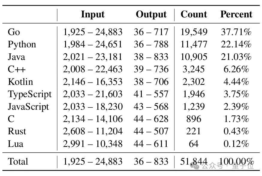 真实场景的代码编辑任务显示,输入提示长度跨度从1925到24883字符,输出编辑长度从36到833字符,且需兼容Go、Python、Java等10种主流编程语言。