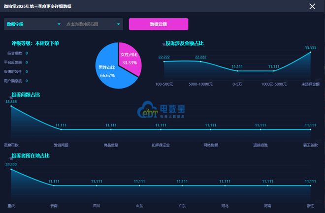 2025年第三季度中,微拍堂投诉问题占比TOP5为恶意罚款、发货问题、商品质量、扣押保证金以及网络售假;投诉涉及金额占比TOP3为100-500元、5000-10000元、0-5万元;投诉者所在地占比较高的前五个地区为重庆、云南、四川、山东以及广东。