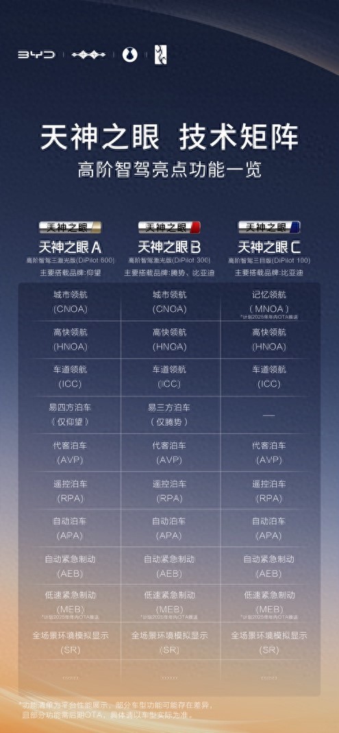 天神之眼 C - 高阶智驾三目版(DiPilot 100):以高于行业的智驾标准实现技术普惠全民智驾,搭载在比亚迪品牌,首批上市21款车型,覆盖7万级到20万级。配备5颗毫米波雷达+12颗摄像头+12颗超声波雷达的“5R12V12U”多传感器融合方案,实现架构、传感器、算法、数据四大领先,覆盖高快领航(HNOA)、城市记忆领航(MNOA)(25年底OTA)、代客泊车(AVP)等用户最在意、最需要的场景。