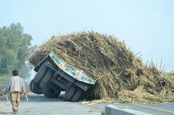 5.装甘蔗的超载卡车,直接压断前轮悬挂,太惊险了,希望人没事吧。
