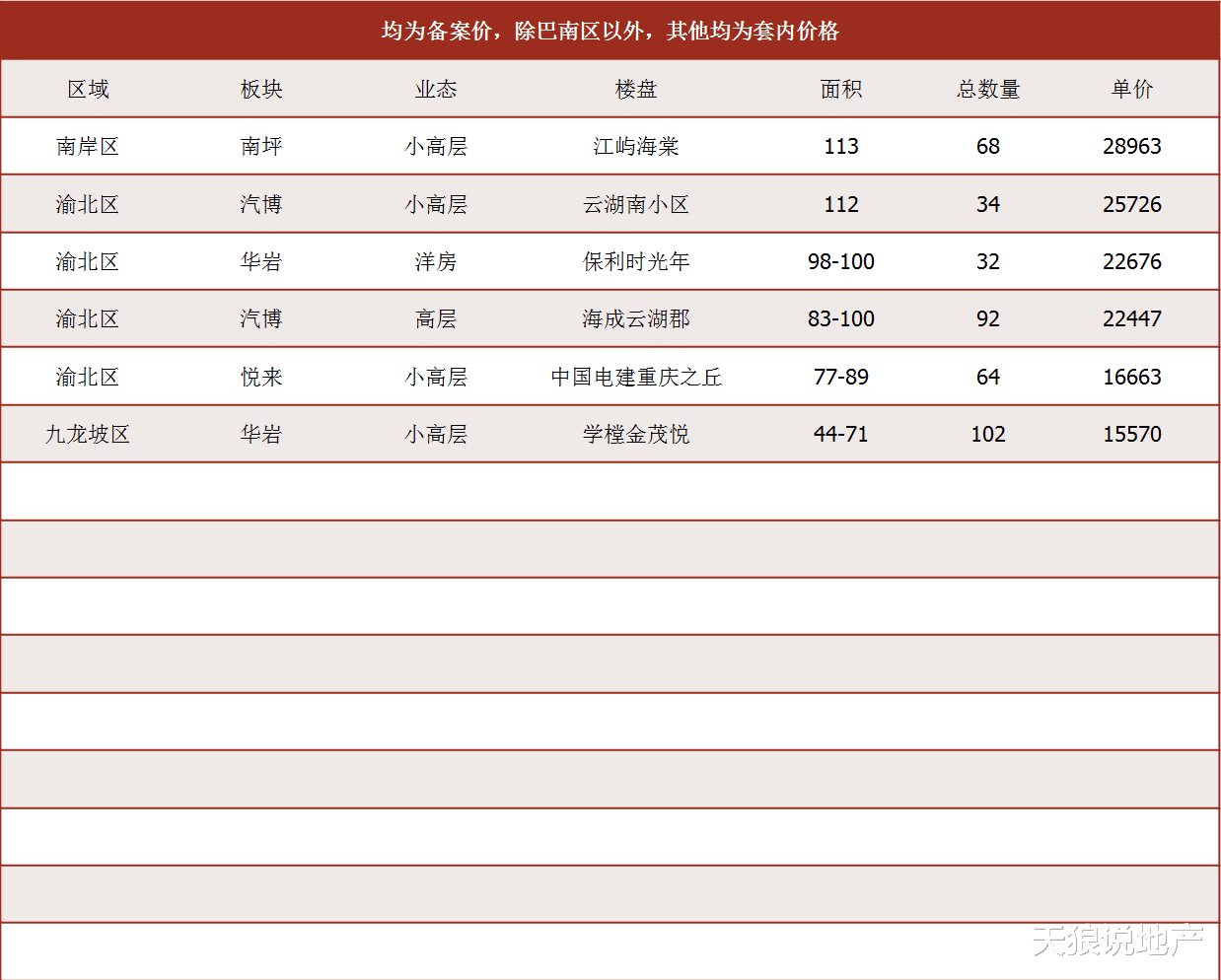 注释:除巴南区以外,其他区域均为套内价格