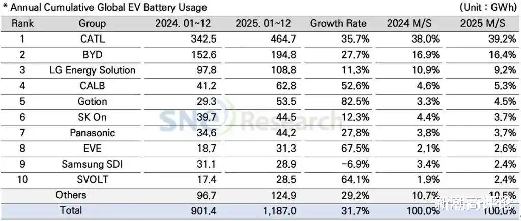 与之形成鲜明对比的是中国厂商的表现,前十名占据6席,分别是宁德时代(CATL)、比亚迪(BYD)、中创新航(CALB)、国轩高科(Gotion)、亿纬锂能(EVE)、蜂巢能源(SVOLT),合计市场份额超过70%,达到70.4%,较2024年提高了3.3个百分点。
