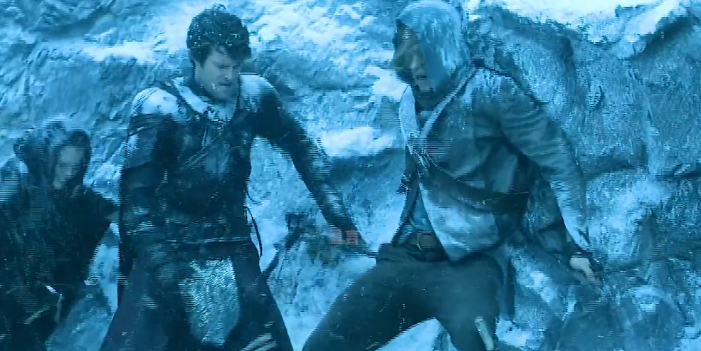 当海格两人赶到王国时, 6 名勇士早已遇害,只有离开王宫的哈利幸存了下来。众人从哈利留下的信封中得知,他去到了自己姑姑家。为了保护哈利不受到恶魔的杀害,海格立马带上了罗恩,就找到了哈利的姑。从他的口中知道了哈利的位置后,罗恩连忙赶了过去,想确认哈利的安全,不过却意外地撞见了这鲜艳的云,看的罗恩眼睛都直了,一不小心就摔倒在了地上。等他再次起身时,哈利却消失在了瀑布下。接着罗恩一转身,只见对方拿着剑架在了自己脖子上,罗恩赶紧表明了来意,才让哈利放下了戒备。