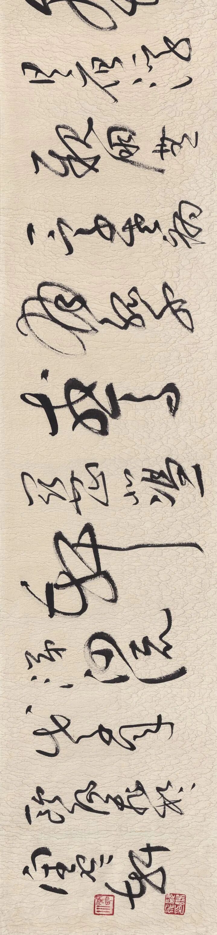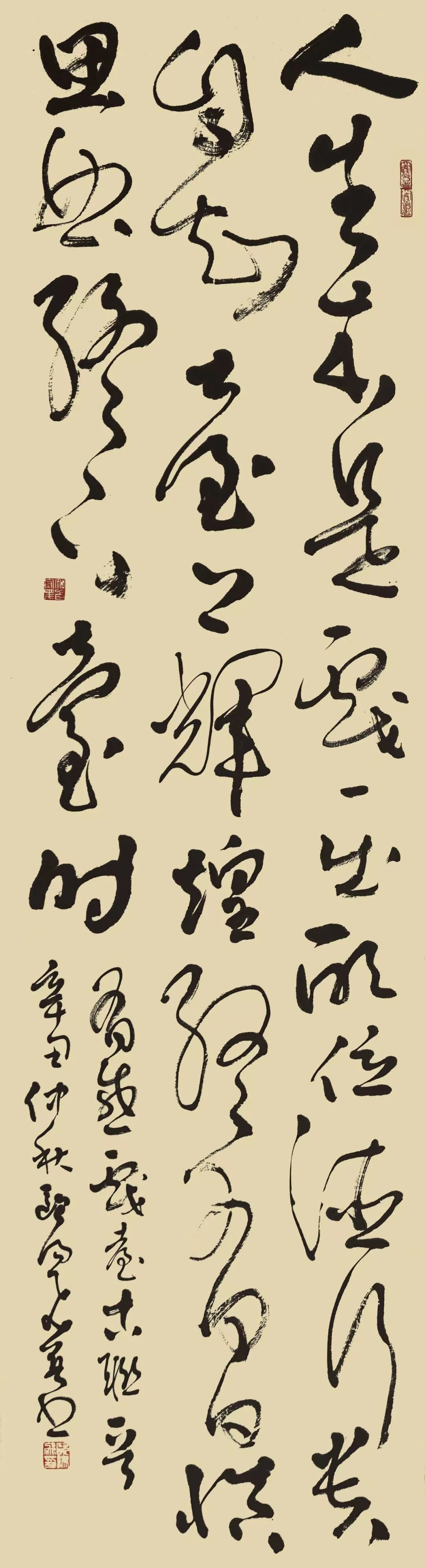 若再细心品读欧阳先生的作品,我们还不难发现,其作品在汲取晚明书家营养的同时,又与之又拉开了一定距离,显得没有晚明书家作品那么焦灼,也没有当代学晚明的一些书人那般夸张和经营之态,而是在宣扬豪迈之气的同时,不时总能隐现出百般的柔情,这显然是由欧阳先生本人的内心世界决定的,正所谓“相由心生”。这一柔情的作用,使得其作品在豪放之中又平添了秀丽、婉约之态。这又可以让我们品味到:先生既是一个义气之人 ,亦是一个多情之人。