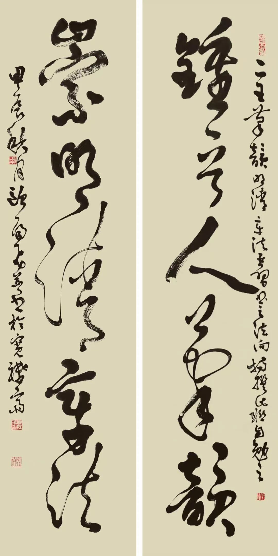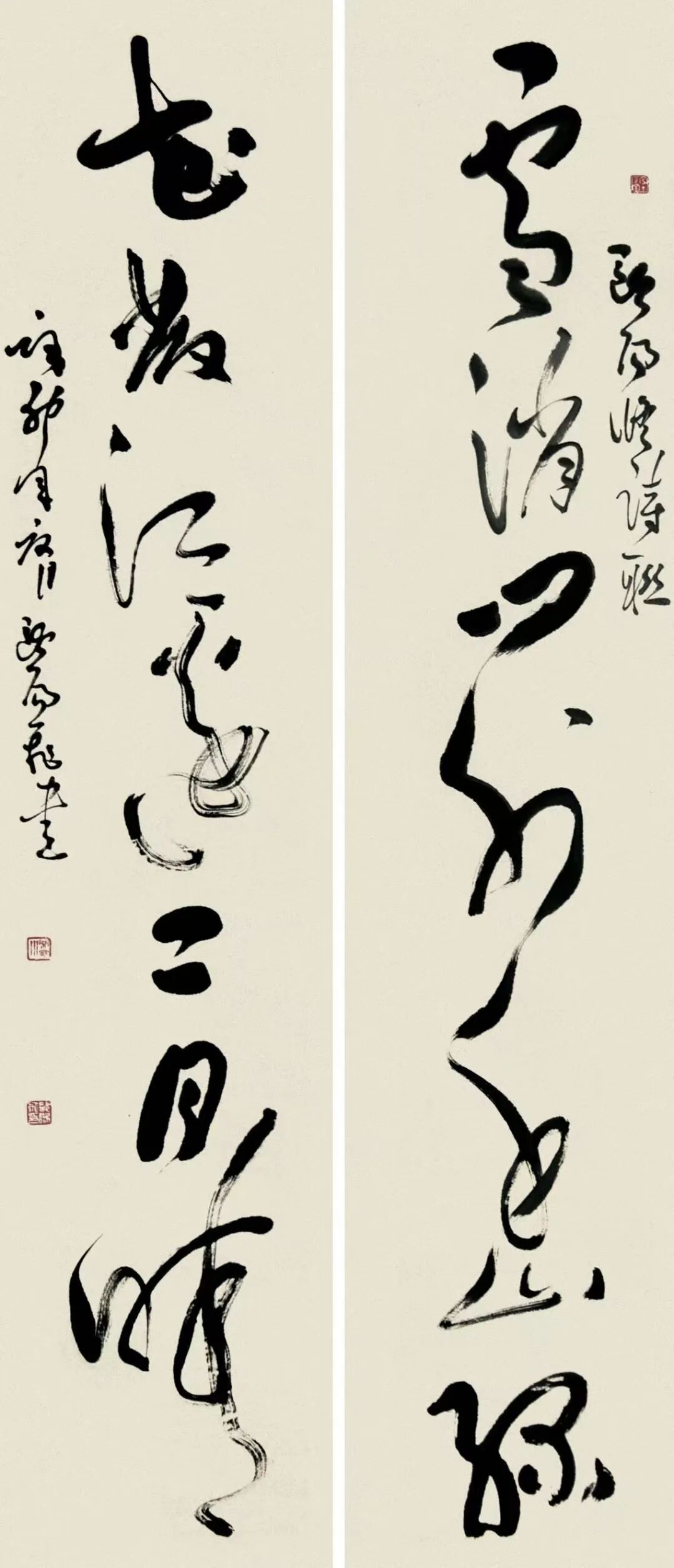 另外,还可以从欧阳先生的作品中发现,多字草书作品中的“气”的表现相对要平和。我个人认为,显然这是由篇幅决定的,通篇的“气”要有所分配,不可歇斯底里,亦不可“断气”。同时,这也是身体生理决定的,在传统的艺术中,书法是最为讲究“人”性的,有时从生命呼吸的气量也可理解书法“气”之一二。一定的气量只能运行一定的时间,超出时限,势必喘息,一定的气量呼吸之间,调停得当,就形成了节奏和韵律,反之、则节奏失调。多字草书作品就是以此传达出与人相通可感的呼吸的。欧阳先生的作品能给人呼吸闲适之感,足可见先生闲庭漫步之内心。但在对联或少字作品中,欧阳先生在表现的时候,则显得更为充盈和连绵,仿佛让人感到先生在书写时激情满怀之状,这从其《雪消花发》对联中可充分体察这种潇洒与激情的挥洒处理。