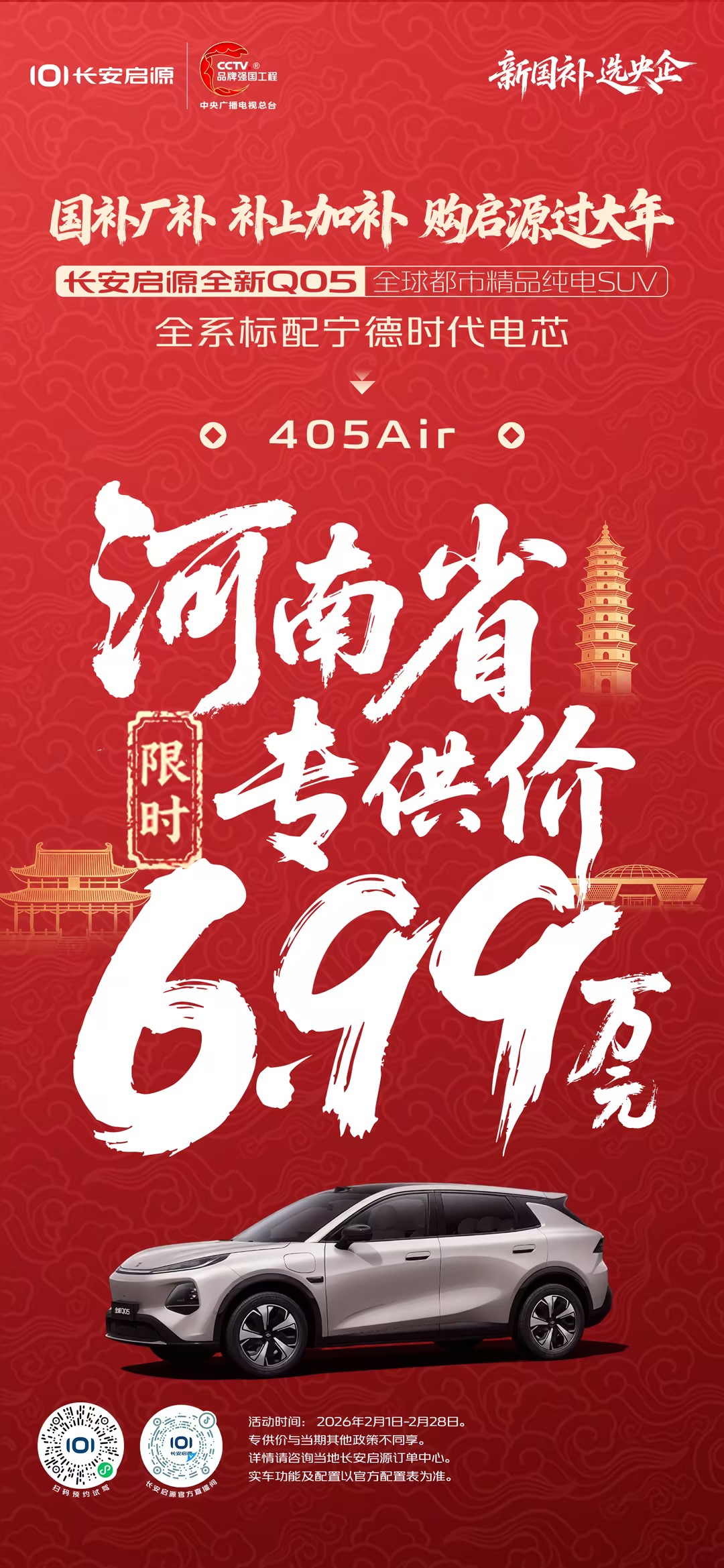 长安启源全新Q05 405 Air本次针对河南省用户,推出了限时专供价6.99万元,价格下探以央企实力与诚意,为用户送上新春购车惊喜。此次专属优惠政策力度空前,活动周期有限,赶紧在2026年2月1日至2月28日下订购买心仪座驾,开启新一年的品质出行。