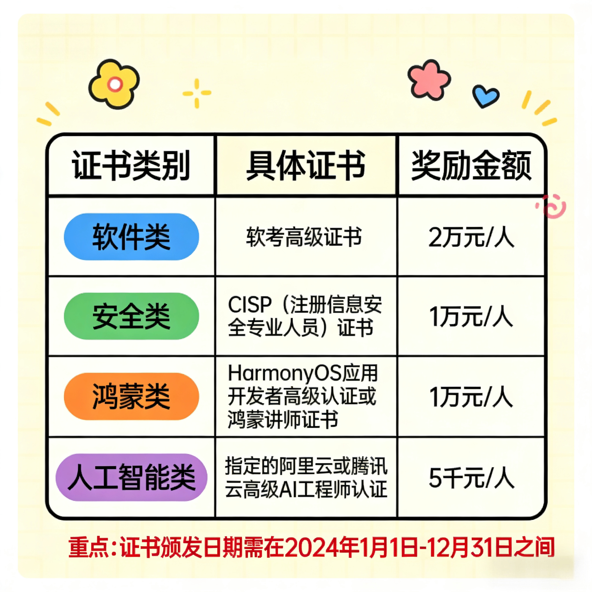 不是所有证书都符合要求,官方认可的主要是这四类,奖励明码标价: