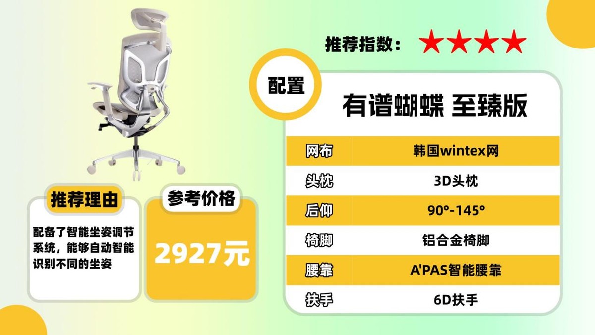 有谱蝴蝶至臻版人体工学椅的椅背为仿生蝴蝶铝合金支撑架,颜值很高,加宽加大设计在后仰时能保持稳定牢固。椅身采用韩国进口WINTEX网布,能够有效分散压力,结合座垫前倾辅助设计,更好贴合腿臀部,减轻久坐压迫感。配备145°大角度后仰功能和4D双面大曲面头枕,可提供近乎平躺的午休体验。A'PAS智能腰靠能精准支撑第1至5节脊椎,保护腰部健康,配合5D联动后仰扶手,在后仰时持续支撑手臂,整体坐感舒适且贴合人体曲线。