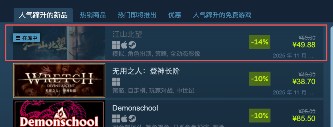 11月20日,作品在Steam平台正式上线,三小时后便斩获“Steam热门即将推出游戏榜”与“人气蹿升新品榜”双料第一,并成功跻身“全区热销商品榜”第八名,交出了一份较为惊艳的首秀成绩单。