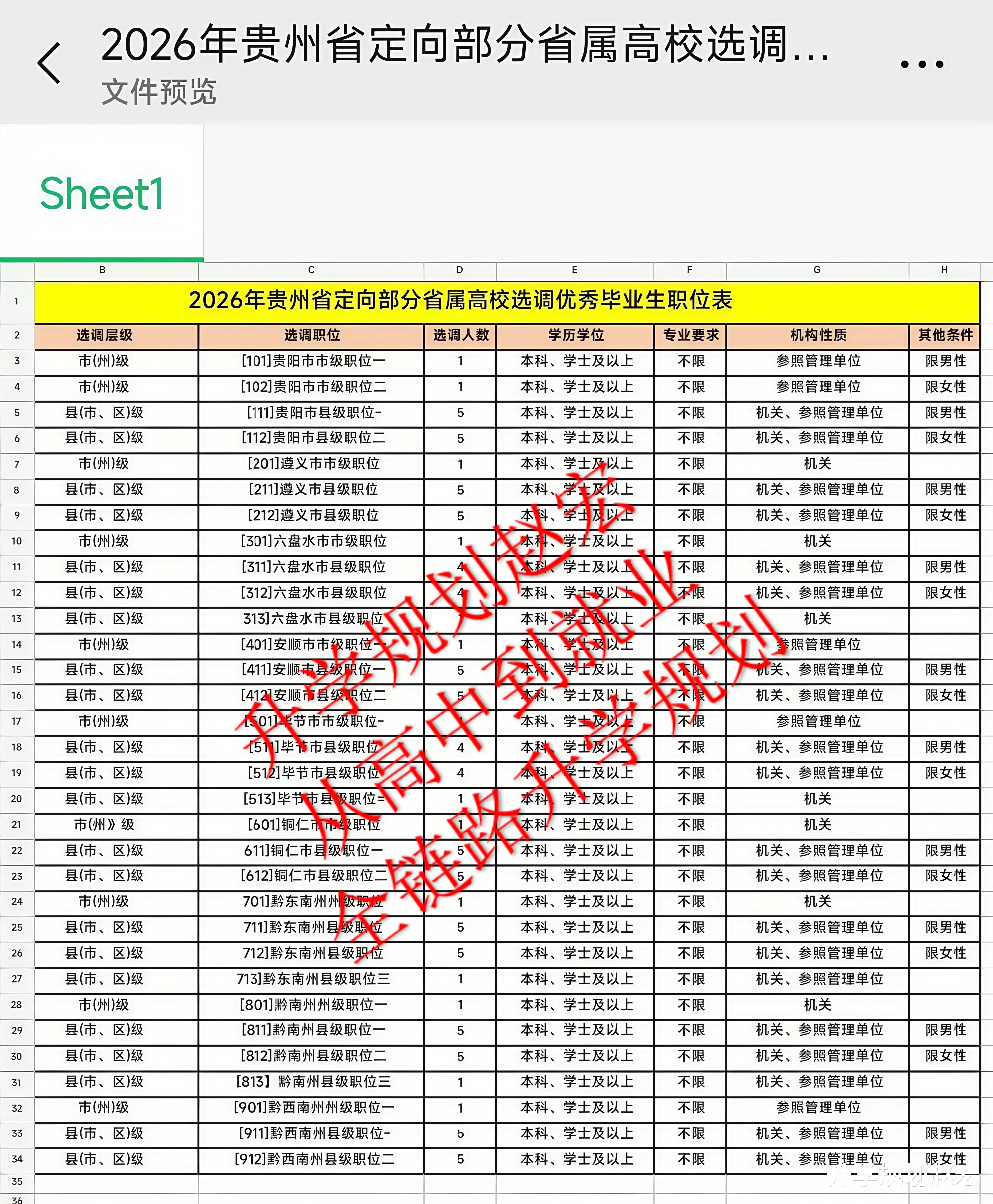 就这几所院校来说,分数最高的600多点,还是优势热门专业,最低的440分450分左右。对于这个分数区间来说,你要是走外省,或者其他的学校,毕业了大部分一样不满足定向选调第一批的要求。如果是省外的院校,定向选调的第二批也不满足,最终只能用国考省考来竞争。这就是为啥分数高点也不见的就是好事,你找到路子了,低分一样的可以拿到非常好的结果,这条路很多县城体制内的家庭早就开始走了。再说句题外话,为啥要去增加省内的这部分院校,为啥不去选择更多的985或者211大学,仔细品品。接下来我们看看贵州省2026年定向选调第二批详细的职位表。