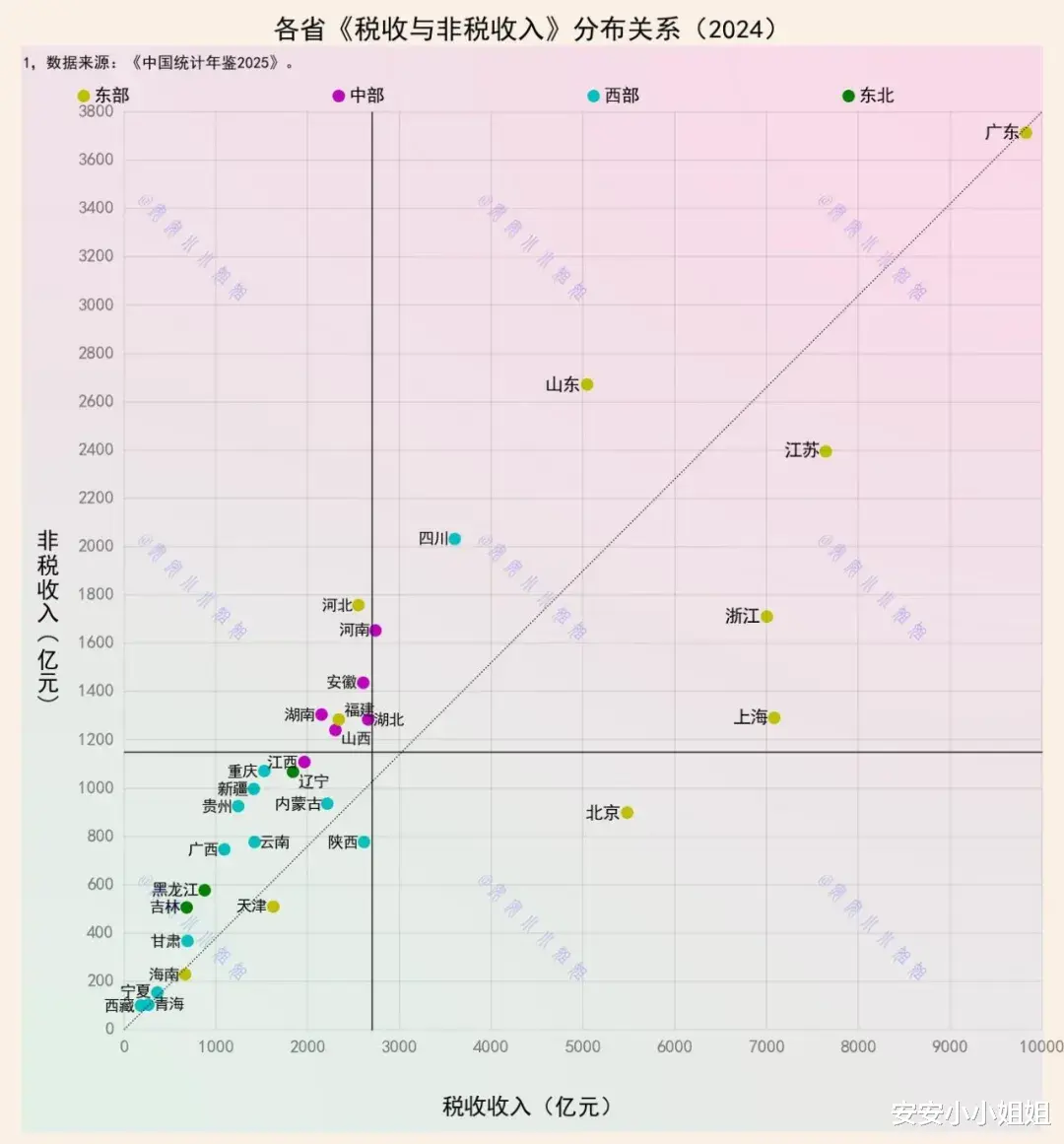 这张2024年各省税收与非税收入分布关系图,便清晰地揭示了这笔“钱袋子”里的结构差异。