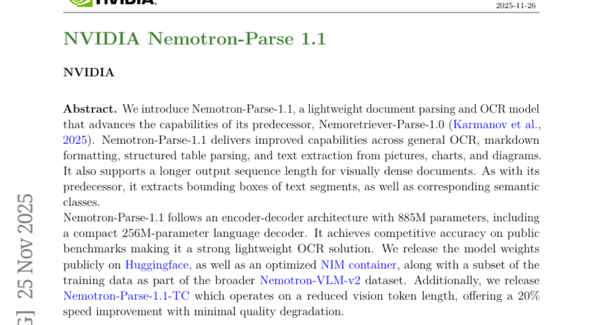 这项由NVIDIA公司研究团队开发的Nemotron-Parse 1.1模型研究发表于2025年11月26日,完整论文可通过arXiv:2511.20478v1查询。研究团队包括来自NVIDIA的多位专家,他们在文档光学字符识别(OCR)和解析领域取得了重要突破。
