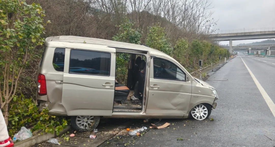 民警抵达现场时,看见一辆贵C籍面包车停驶在道路路肩与应急车道内,车上5人均已撤离到安全地带,在确认车上5人没有受伤后,民警立即对现场展开勘查。经勘查,发生事故的面包车前保险杠已经完全脱落,右前轮胎爆胎,事故地点遗留有大量油渍,疑似发动机受损。