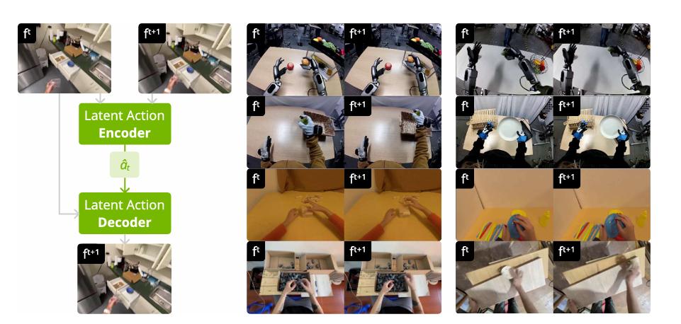通过这种设计,潜在动作成为了连接人类视频与机器人控制的通用桥梁。在预训练阶段,模型通过自我监督的方式,学习如何从像素变化中推断出潜在动作,并利用这些潜在动作预测下一帧画面。