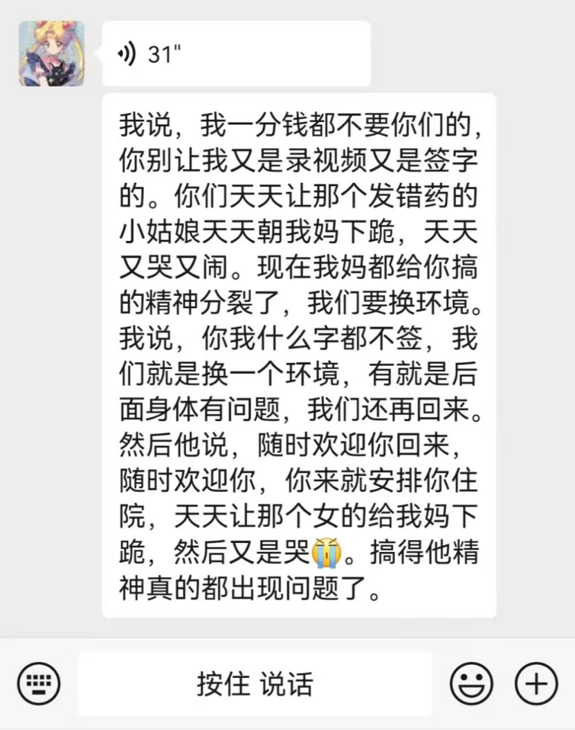 对此,她明确回应:“我一分钱都不要你们的,你别让我又是录视频又是签字的。你们天天让那个发错药的小姑娘天天朝我妈下跪,天天又哭又闹。现在我妈都给你搞的精神分裂了,我们要换环境。”