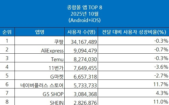 据韩国零售分析机构WiseApp Retail数据,今年10月,这三家平台已集体跻身韩国综合购物应用月活跃用户前十,显示出深厚的用户渗透力。