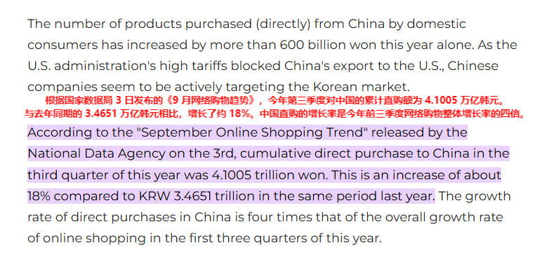 这一增速是同期韩国网络购物整体增速(4.5%)的四倍,凸显出中国商品在韩国市场的强劲增长势头。