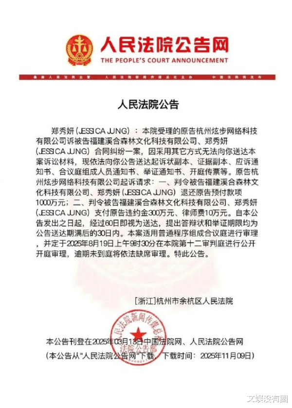 近日,网上披露了杭州炫步网络科技有限公司起诉JESSICA郑秀妍,要求其退还预付款 1000万元人民币,并支付违约金300万元,及律师费10万元,共计1310万元人民币的消息。因此,网上传出了“郑秀妍已败诉,欠债千万”的传闻。
