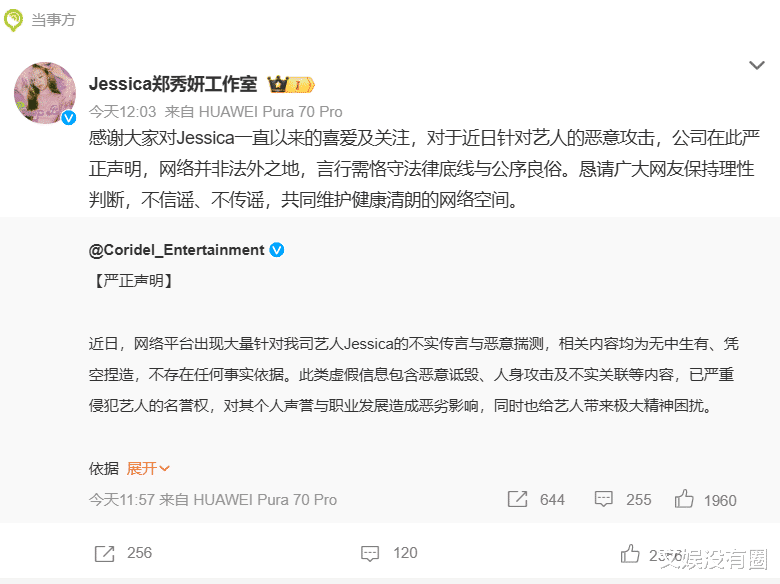 面对网上的各种猜测,郑秀妍所属经纪公司Coridel Entertainment 发布严正声明,称“相关内容均为无中生有、凭空捏造,不存在任何事实依据。”并呼吁道“网络并非法外之地……恳请广大网友保持理性判断,不信谣、不传谣。”
