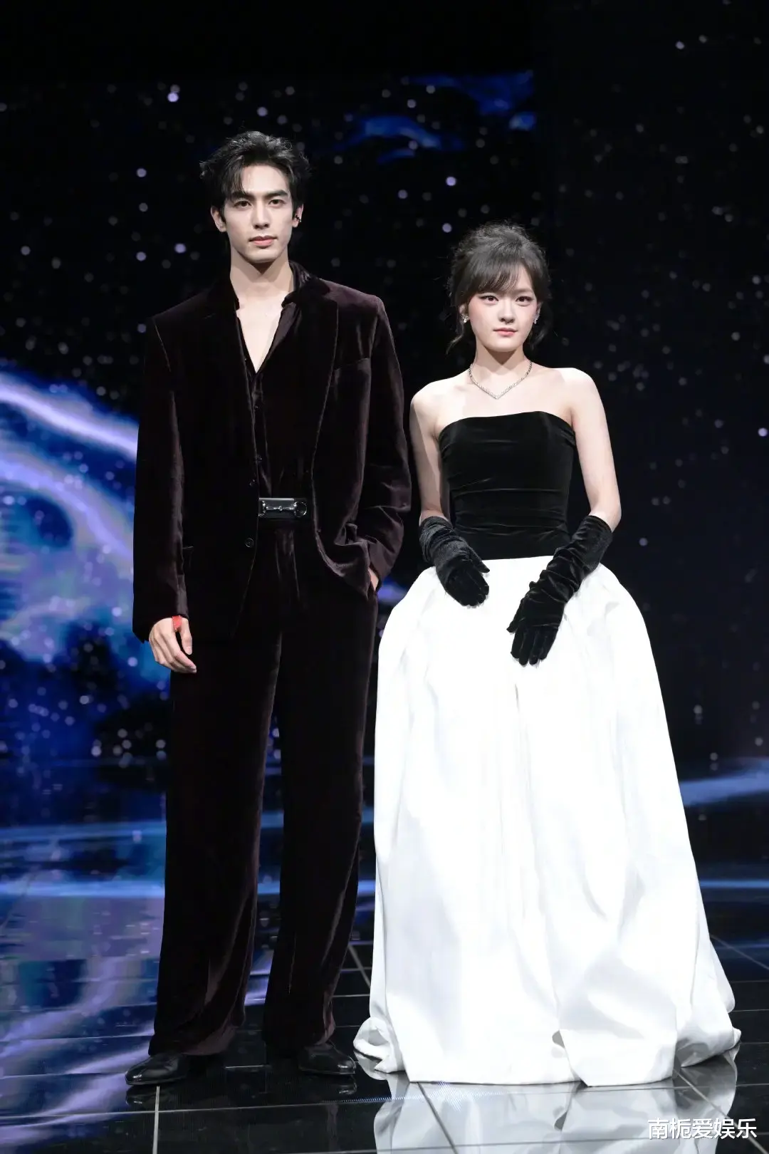 就在众人沉浸于电影质感的氛围时,宋威龙突然折返,在文淇耳边打了个清脆的响指,瞬间打破严肃框架。这个即兴的恶作剧让文淇瞬间“破功”,佯装恼怒地挥拳追打,眉眼间的笑意如涟漪般荡开。185cm的“西装大佬”与162cm的“暴躁妹妹”,在红毯上上演了一场“小学鸡打架”式的追逐,身高差带来的喜剧张力让现场笑声不断。