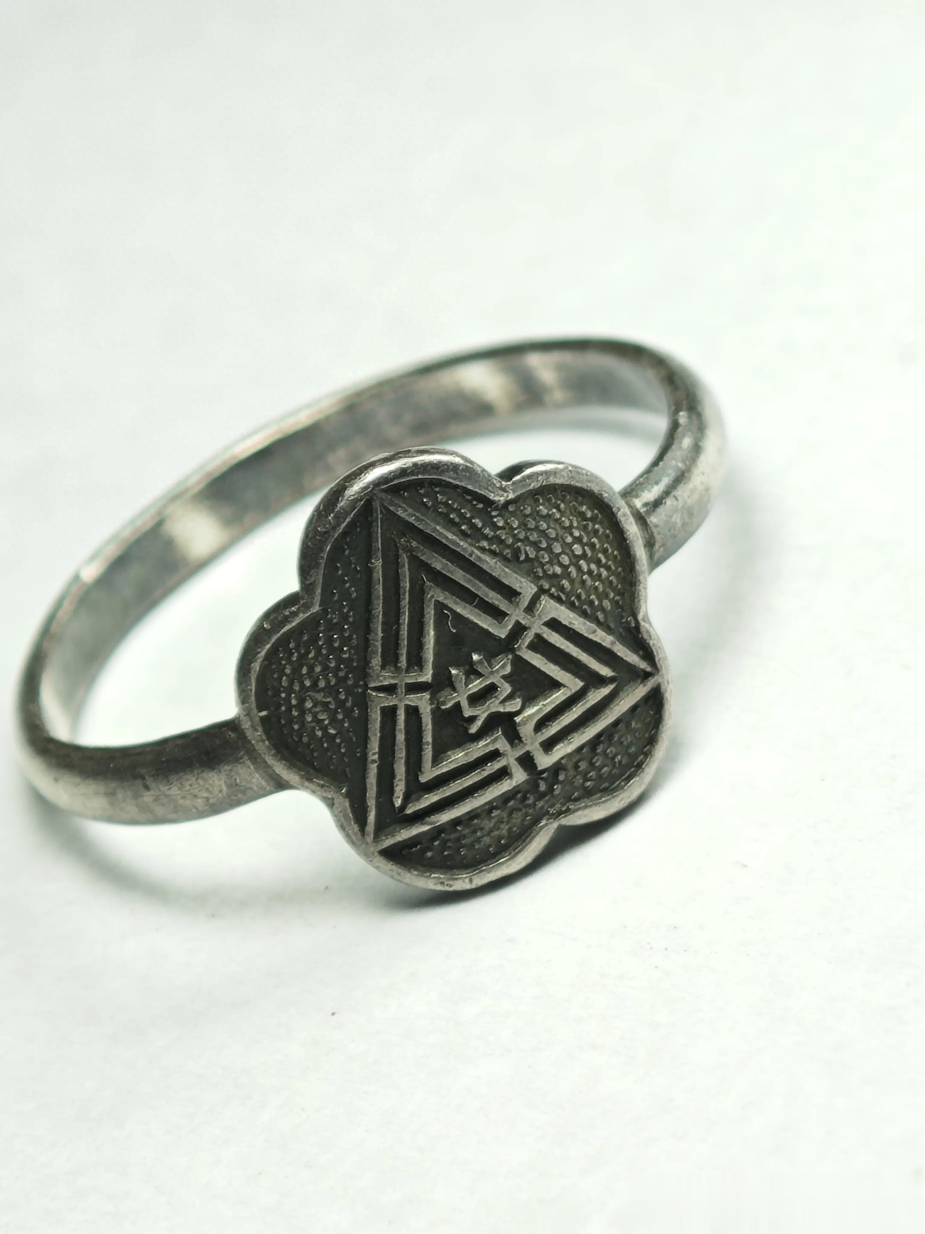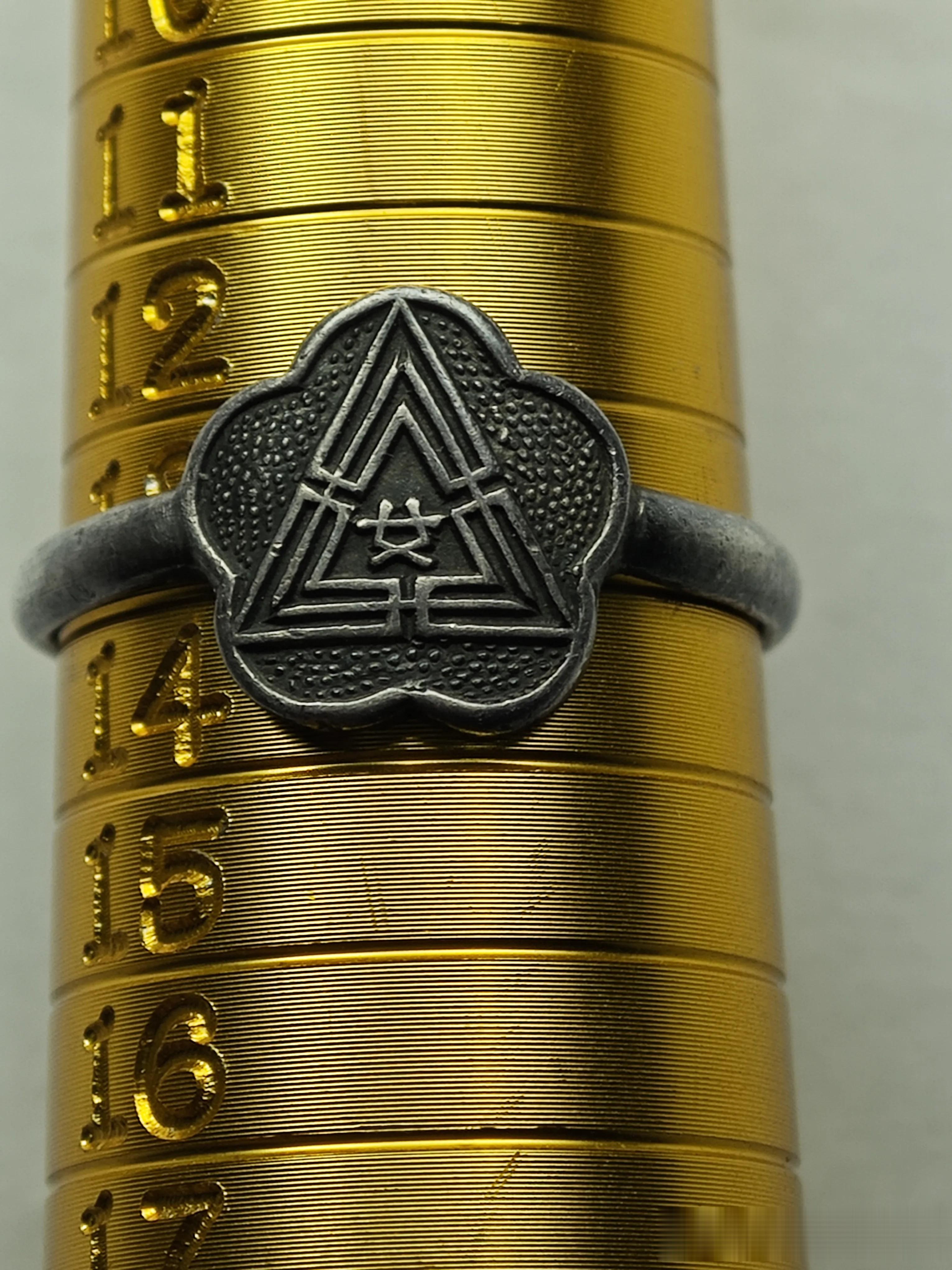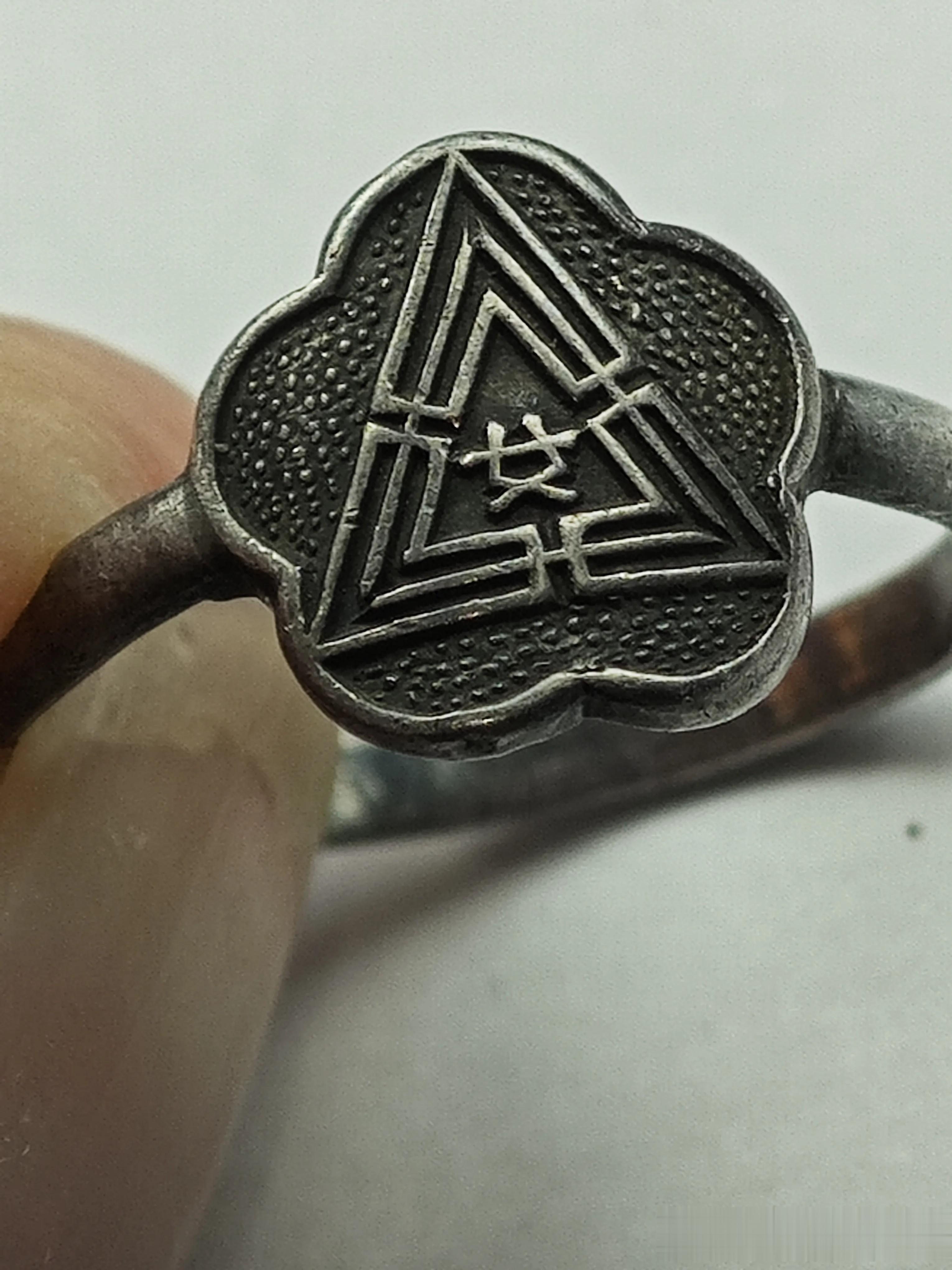 - 戒面是梅花花瓣形(民国女校偏爱柔美元素),也是民国国花!暗纹是细密的“珍珠底”样式(老银匠的手工痕迹);