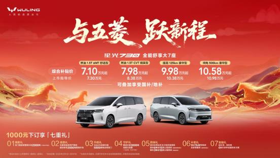 为回馈更多新老用户,五菱还带来新春购车礼遇:即日起,以1000元下订星光730,即可享2000元无门槛超级置换补贴、老用户换购叠加2000元置换补贴、选装电滑门、龙膜太阳膜、三电终身质保、充电桩、多种金融购车方案等七重礼,让「全能舒享大7座」陪伴更多家庭开启舒适团圆年。