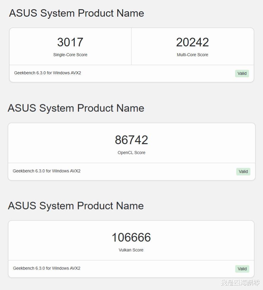 用GeekBench 6.3.0软件测试,CPU单核性能得分:3017,CPU多核性能得分:20242,其OpenCL的分数为:86742,而Vulkan的分数为:106666。
