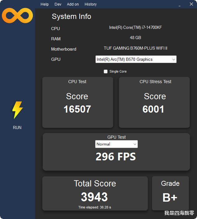 使用微软应用商店里的一款PC评测软件Infinity Bench对整机进行性能测试,CPU测试得分:16507,CPU Stress测试得分:6001,GPU测试帧率为:296 FPS,总体得分为:3943,评分为:B+。