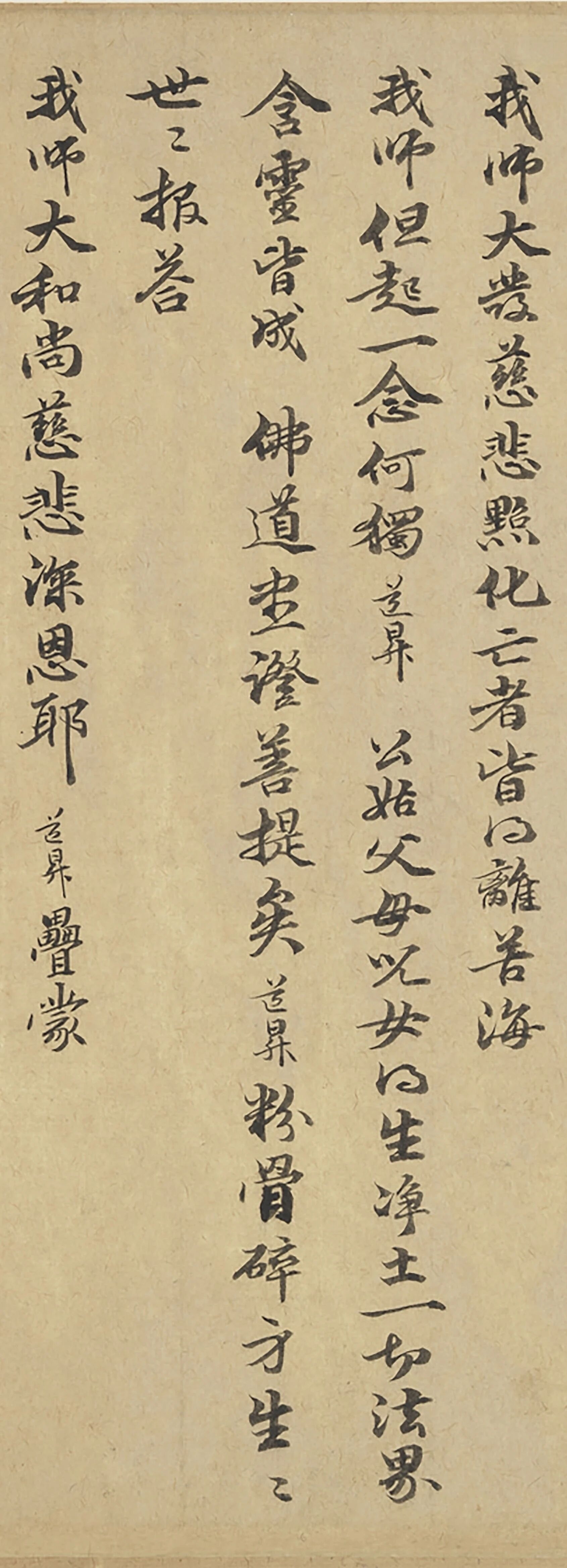 释文:和南拜覆本师中峯大禅师法座前。女弟子管氏道升谨封。道升和南拜覆本师中峰和尚大禅师法座前。道升拜别顶相。动是数载。瞻仰之心。日积不忘。年时得以中首座来都。如见师父尊颜。备审道体清安。甚为慰喜。道升手书般若经。报荐先父母深恩。及救荐亡儿女轮回之苦。极感谢我师大发慈悲。点化亡者。皆得离苦海。我师但起一念。何独道升公姑父母儿女得生净土。一切法界含灵。皆成佛道。尽证菩提矣。道升粉骨碎身。生生世世。报答我师大和尚慈悲深恩耶。道升叠蒙赐书。知前年吾师所惠书。及录题经赞法语寄来。至今并不曾收得。不审当元何人送去。闻知怏怏。道升一面作书于家间问舍姪去也。去岁以中送去般若经五卷。又蒙本师慈悲。展读点化。又各得题赞。存没重感我师。道升宿业甚重。每日人事扰扰。不能安静。长想我师慈悲指教。寻思话头。但提起终得受用。道升与良人诚心至愿。但得到家。只就家庭修设。拜恳本师大和尚。大发慈悲。普度一切鬼神。一切有主孤魂。一切无主孤魂。一切冤亲。良人与道升祖上父母儿女外祖妣奴婢。及一切法界含灵。莫堕三涂恶苦。愿皆得早生佛界。此乃良人与道升心愿。已托以中兄先覆知师父大和尚。今春仆回。又拜吾师惠书。及心疏。道升等拜观。如心如愿。良人见之。生欢喜心。尤增感佩。我师如此大发慈悲。度脱一切众生。是道升等七世父师之恩。何以报谢深恩。今因的便。特拜此书报安。更乞善保爱。不宣。六月初七日。女弟子管氏道升和南拜覆。