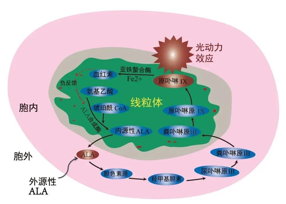☆ 氨酮戊酸(ALA)的代谢是人体内亚铁血红素合成的生化途径的第一步。ALA 自身不是光敏剂,而是光敏剂原卟啉 IX(PpIX)的代谢前体。ALA 的合成通常是由细胞内亚铁血红素水平通过 ALA 合成酶反馈抑制调控。外源性的 ALA 避开这种调节,导致 PpIX 的累积。皮肤应用盐酸氨酮戊酸后因 ALA 转化为 PpIX 并累积而产生光敏性。当暴露在一定波长和能量的光照下,累积的 PpIX 就会产生光动力效应,一种光和氧依赖性的细胞毒作用:PpIX 吸收光后处于激发态,其随后与氧分子发生电子传递而产生高度活性的单线态氧和自由基。应用 ALA 后病灶的光敏性与特定波长和能量的光照是 ALA 光动力治疗的基础。