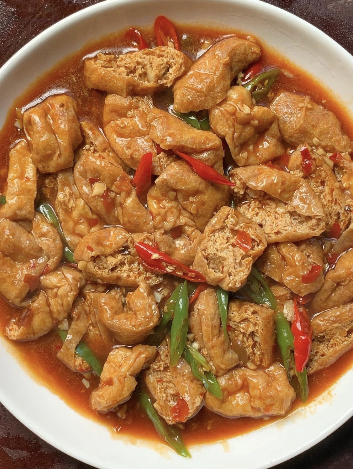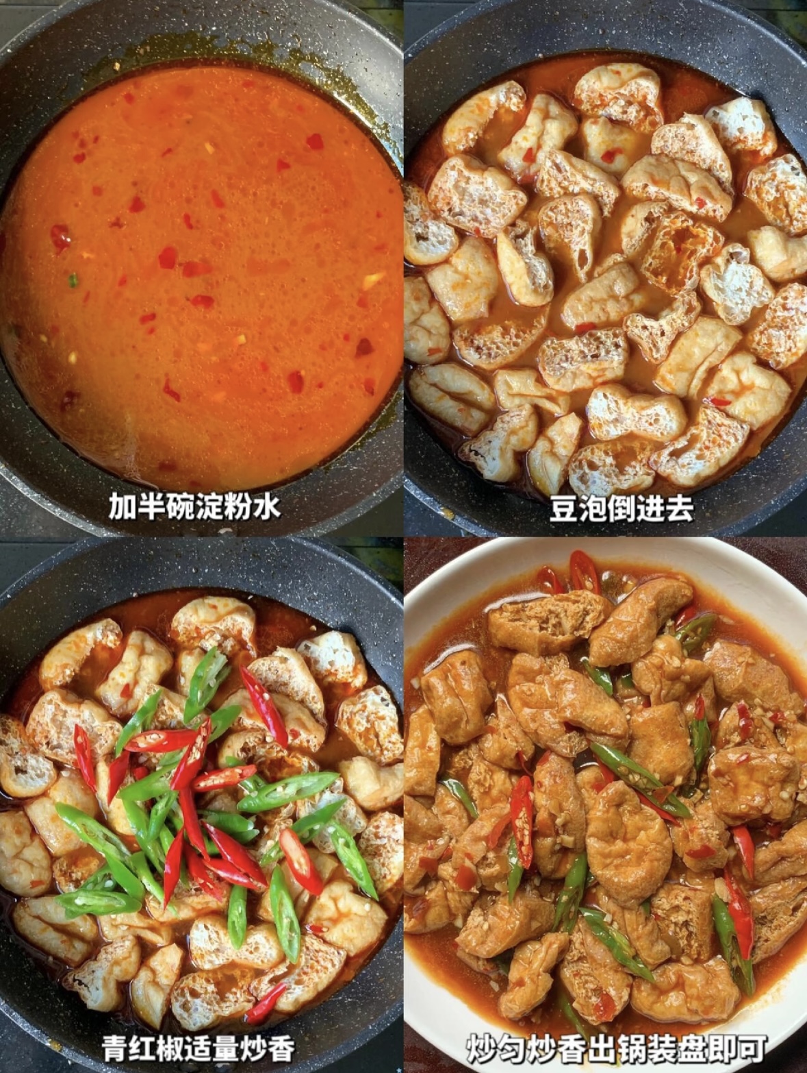 豆泡对半切,切面毛茸茸像小海绵,哗啦啦倒进锅里,用筷子来回扒拉,让每一面都蘸上红油。加半碗热水(别多,没过豆泡一半就够),盖盖子中火焖2分钟,让豆泡从“干面包”变身“汤汁小炸弹”。时间到,开盖,倒入青红椒,转大火收汁,汤汁咕嘟咕嘟变浓稠,泡泡由大变小,最后“呲啦”一声贴在豆泡上,关火、装盘、撒葱花,全程不超过8分钟。